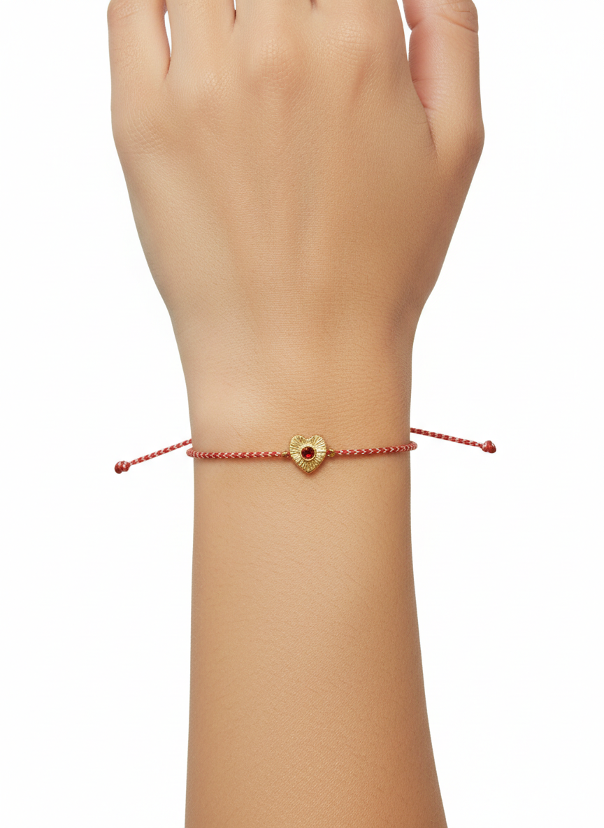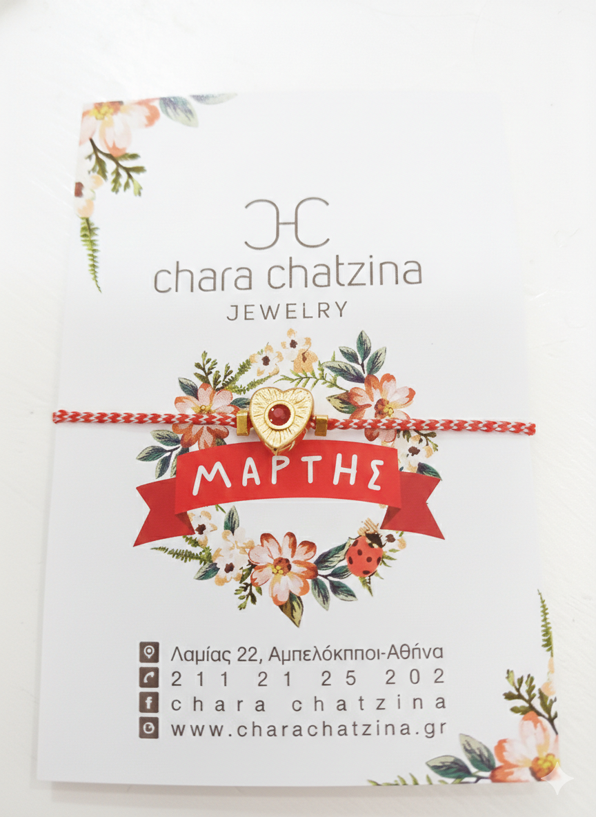 Χειροποίητο βραχιόλι Μάρτης με στοιχείο χαρακτή καρδούλα με κόκκινο σμάλτο, σύμβολο αγάπης και προστασίας.